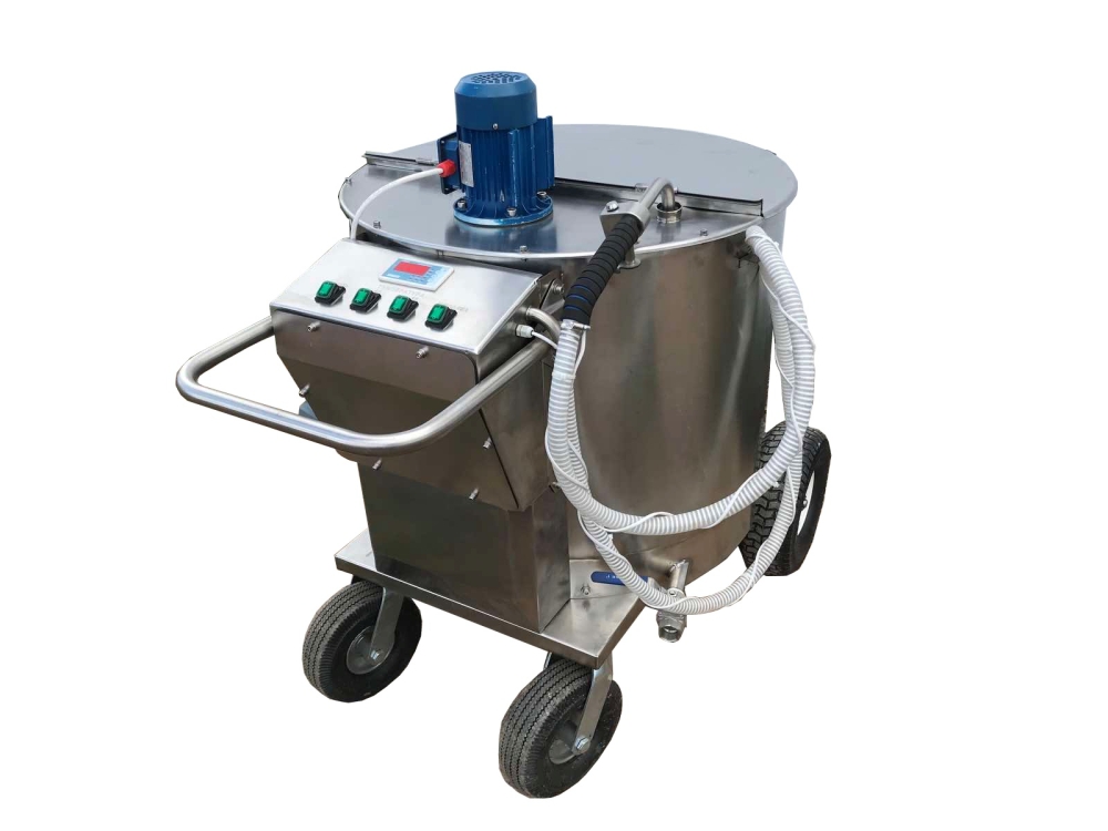 Молочное такси для подогрева молока, приготовления ЗЦМ с последующей раздачей. Состоит из нержавеющего бака и нержавеющей передвижной платформы, блока электроники. Оснащено электрическими ТЭНами, замешивающим миксером с электродвигателем, передвижной 4х колесной платформой, раздаточным пистолетом, удобной ручкой для перемещения. На панели управления расположены 4 переключателя, а также дисплей с отображением температуры в реальном времени. Изготовлено из пищевой нержавеющей стали AISI 304.