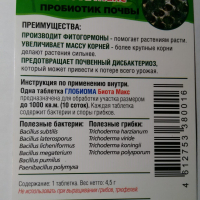 Представляет собой быстрорастворимую в воде таблетку, в которой содержатся полезные бактерии семейства Bacillus шесть видов , споры грибов семейства Trichoderma четыре вида и один вид азотофиксирующих бактерий Paenibacillus polymyxa.